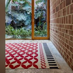 Confeccionada con hilo de pura lana virgen con la técnica del kilim , un método milenario que no utiliza nudos y con el que se obtienen alfombras planas, ligeras, reversibles y sin pelo.