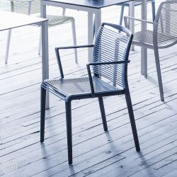 Silla con reposabrazos apta para exterior.