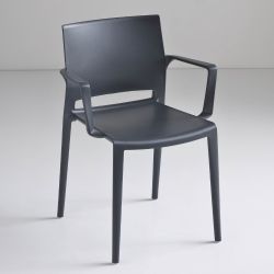 La silla Bakhita con reposabrazos de Gaber está fabricada en tecnopolímero mediante un proceso de inyección de plástico 2K, lo que la hace robusta y duradera. Está disponible en varios colores y se puede solicitar un cojín. Cuando no se usa, se puede apilar hasta cinco sillas.