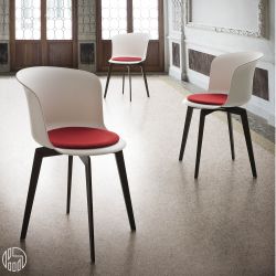 Las patas y el asiento están disponibles en diferentes colores; el asiento está equipado con un cojín acolchado integrado, que se puede pedir con varios tipos de tapicería.