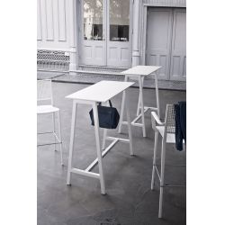 Mesa alta con estructura de metal sobremoldeado con tecnopolímero y tapa en laminado Compactop.