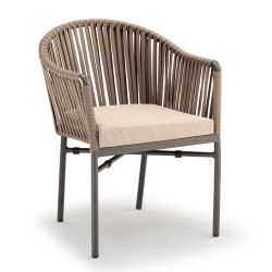 Un único elemento conecta el respaldo y los reposabrazos, revestidos de textileno efecto cuerda y ecomimbre .