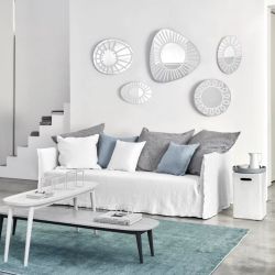 Sobre la superficie una decoración pintada de blanco traza visualmente el borde del espejo creando divertidos reflejos. Cada modelo es diferente por forma, dimensión y diseño: