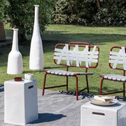 Está fabricado en aluminio pintado con acabado gofrado . Los cinturones elásticos que recubren la estructura la hacen cómoda y flexible: el respaldo está revestido con un patrón de líneas horizontales y en zig-zag, mientras que el asiento tiene una trama más densa, en damero.