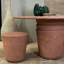 Kasane S es un taburete bajo con una textura matérica. Está pensada para el exterior pero también queda perfecta en la zona de estar o en la zona de noche de la casa.