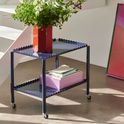 Fabricado en acero con recubrimiento en polvo , cuenta con dos estantes. El perfil con motivos semicirculares embellece las formas y da profundidad. La base está equipada con ruedas.