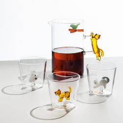 El vaso con forma de gato atigrado, con su diseño moderno y adorable, es ideal para decorar la mesa o como regalo. Hecho a mano en vidrio de borosilicato, presenta figuras de gatos en miniatura.
