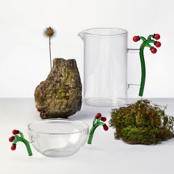 Fabricada artesanalmente en vidrio de borosilicato, esta jarra de diseño permite admirar pequeñas verduras colocadas en su interior en la parte inferior. La jarra se puede utilizar para servir agua o cualquier otra bebida, convirtiéndose también en un elemento decorativo para la mesa. Perfecto para combinar con gafas de la misma colección.