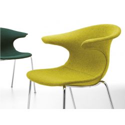La estructura de trineo está disponible en acero cromado o pintado . Apilable hasta dos alturas, esta silla, fabricada en Italia, está disponible con asiento tapizado en una variedad de telas. Además de las disponibles, también hay otras tapicerías disponibles; consulte la ficha técnica adjunta.