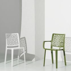 Con un respaldo que presenta una sofisticada perforación geométrica que evoca formas orgánicas, es la solución ideal para proyectos que requieren un fuerte impacto visual sin sacrificar la funcionalidad técnica del polipropileno.