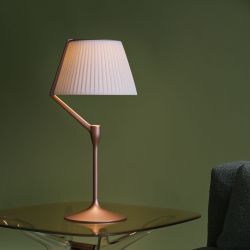 Angelo Stone es una lámpara de mesa que renueva el concepto de luz. De hecho, su peculiaridad reside en la posición de la fuente de luz, que no se encuentra dentro de la pantalla sino en la parte terminal del vástago. La luz LED ilumina el sombrero de abajo hacia arriba y se difunde en la habitación gracias a la pantalla de policarbonato revestida de tela con efecto plisado.