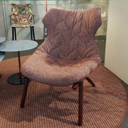 Un sillón de diseño que expresa el diálogo entre lo natural y lo artificial. Su suave asiento evoca la imagen del follaje de un árbol, con sus hojas realzadas por costuras especiales.