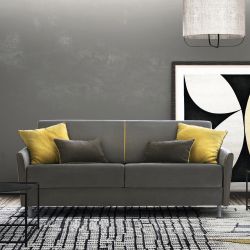 El mecanismo del sofá cama se abre con un solo movimiento, sin tener que quitar los cojines del asiento ni del respaldo. La estructura es de acero pintado brillo.