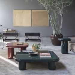 Estas mesas de centro cuentan con un tablero de madera con estructura de panal y patas rígidas de poliuretano. La superficie lacada está disponible en una amplia gama de colores con acabado mate o brillante.