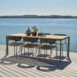 La colección 101 de mesas y sillas de Mindo tiene un diseño cálido y acogedor. Ideal para amueblar el comedor exterior de tu casa, esta mesa tiene una estructura de aluminio pintado y un tablero disponible en dos modelos: cerámica o listones de teca con inserto central cerámico.