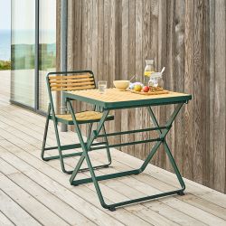 La mesa y las sillas plegables de la colección 121 de Mindo son muebles prácticos y funcionales. Perfectas para el balcón o el jardín, están hechas de aluminio pintado y listones de bambú, lo que crea un ambiente cálido en la habitación.