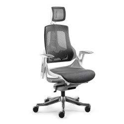 El respaldo y el asiento acolchado están realizados en malla gris transpirable ; esta silla está equipada con ruedas de goma, ideales también para suelos de parquet.