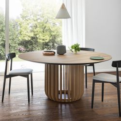 La protagonista de la mesa Juice es la base central: numerosos finos listones de madera , dispuestos a cierta distancia, envuelven un anillo inferior. Esto crea un equilibrio entre espacios llenos y vacíos.