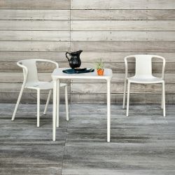 Fabricada en polipropileno, la mesa Air es resistente al uso ya la intemperie; además es apilable hasta 5 unidades y está dotado de hueco para sombrilla.