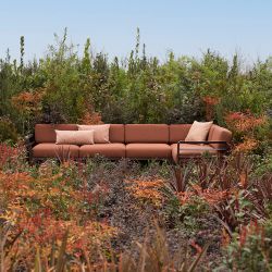 Maximo es una colección de sofás y sillones de jardín compuesta por elementos modulares, fabricada con una estructura de polipropileno reciclado y con cojines generosamente acolchados.