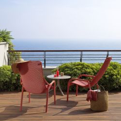 Net Lounge propuesto en seis colores vivos se caracteriza por un asiento con un patrón de pequeños agujeros cuadrados que le dan un aspecto fresco y ligero.