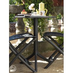 Fabricada íntegramente en resina con fibra de vidrio, esta mesa de jardín es especialmente resistente a los agentes atmosféricos.