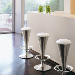 Gracias a la columna en forma de cono al revés que se apoya sobre una base muy amplia, este taburete presenta una forma sinuosa y delgada. Base y estructura son muy estables, mientras que el amplio asiento circular está acolchado para garantizar la máxima comodidad.