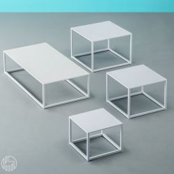 La estructura está realizada en tubular metálico de sección cuadrada 20 x 20 mms y sigue los ángulos de un paralelepípedo. La tapa en laminado mide 10 mms de espesor y cierra la parte superior de este elemento geométrico.