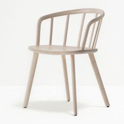 Una reinterpretación contemporánea de las tradicionales sillas inglesas Windsor, Nym está hecha completamente de fresno macizo, el respaldo de madera arqueado se injerta en el asiento con una secuencia de listones de madera.
