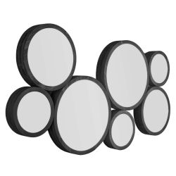Se fijan siete espejos circulares de diferentes tamaños, encerrados en marcos de madera de pino teñida de negro .