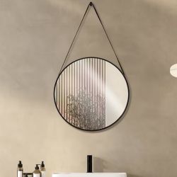 Líneas limpias y detalles refinados para el espejo Balanced. El diseño circular se ve realzado por un elegante borde negro y un cinturón de piel sintética que permite colgarlo en la pared.