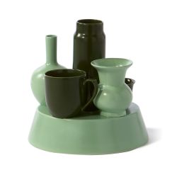 Los tarros se colocan sobre una base, también de porcelana esmaltada. La composición, realizada a partir de tarros diferentes entre sí, aporta dinamismo a cualquier espacio en el que se coloque.