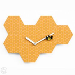 Reloj ideal para habitaciones de los más jóvenes o para dar un toque de alegría y desenfado a las habitaciones. Tiene la forma y gráficos de colmenas donde una abeja amarilla y negra, colgando del minutero, se mueve tranquilamente entre las celdas.