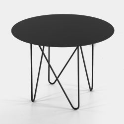 Patas y tapa de acero pintado con acabado arenado. La parte superior es redonda ; las patas son de varilla, siguen un diseño entrecruzado y son redondeadas en la parte inferior.