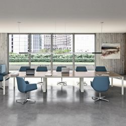 Amplia mesa de reuniones con capacidad para 20 personas, equipada con pasacables. En el centro está sostenido por pedestales que no constituyen un obstáculo para los invitados.