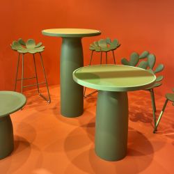 Disponible en dos alturas – 75 cm (versión comedor) y 106 cm (versión alta, ideal también para zonas de bar) – Toto destaca por su base de columna y tablero redondo integrado de 70 cm de diámetro , propuesto en tres variantes:
