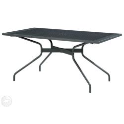 Diseño fresco y clásico para la mesa de metal pintado , ideal para mobiliario de jardín y terraza. RIG34 presenta una estructura de acero pintado con una cubierta superior de chapa perforada con orificio para paraguas (Ø 40 mm).