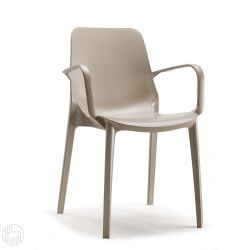 Silla con reposabrazos, totalmente realizada en tecnopolímero reforzado con fibra de vidrio mediante la técnica del air moulding. Este material, muy resistente y flexible, es perfecto para exteriores. Puede ser utilizado también en el jardín o en la terraza, al ser resistente a las inclemencias del tiempo.