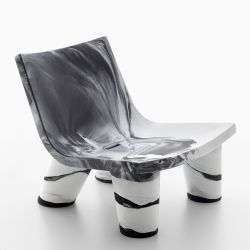 Caracterizada por un diseño limpio y lineal, por un gran asiento y por las cuatro importantes patas que lo sostienen, esta versión está realizada en blanco y negro mediante una particular técnica de moldeado en polietileno que permite obtener un efecto y una mezcla de los dos colores diferentes. cada vez.