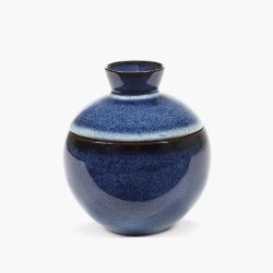 Realizado en cerámica , el recipiente se caracteriza por delicados esmaltes azules , aplicados de forma artesanal.