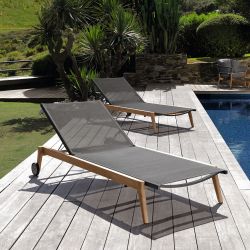 Moderna y refinada, esta tumbona con estructura de teca y asiento de textileno gris decora con elegancia la zona de relajación del jardín y la piscina.