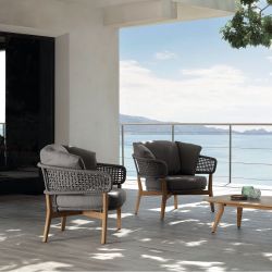 La estructura está realizada en teca natural, mientras que el respaldo, los reposabrazos y el asiento son de aluminio revestido con cuerdas sintéticas de color gris. Los suaves cojines son extraíbles y lavables, con acolchado de espuma de secado rápido.