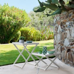 Moderna mesa de centro plegable realizada íntegramente en aluminio pintado y caracterizada por la bandeja extraíble.