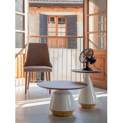 Amira es una mesa de centro con base de cerámica y tapa redonda de madera contrachapada (dimensiones Ø x H: 61 x 36 cm).