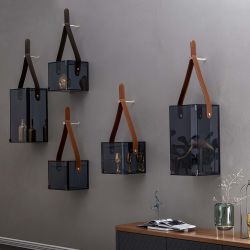 El paralelepípedo de vidrio parece estar sostenido únicamente por una correa de cuero genuino y un soporte de metal con un acabado de latón satinado. En realidad, la parte portante real es el respaldo de polímero con efecto espejo que se fija a la pared.