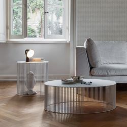 Andra destaca por su diseño esencial y gráfico, compuesto por finas líneas verticales que sostienen un cinturón circular de alambre de metal pintado .