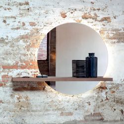 El espejo de 120 cm de diámetro que en esta composición representa al sol está disponible con acabado plateado o bronce. El horizonte es una repisa de madera, mide 160 cm de largo y 36 cm de ancho y cuenta con un elegante portaobjetos cóncavo.