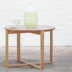 La estructura está formada por la intersección de dos marcos rectangulares de madera. La tapa redonda (∅ 60 cm) tiene un espesor de 20 mm y es de madera maciza, disponible en haya o roble.
