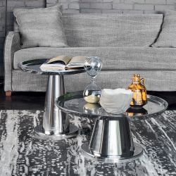 Il est fabriqué en fonte d'aluminium poli . Le dessus circulaire a des bords relevés.