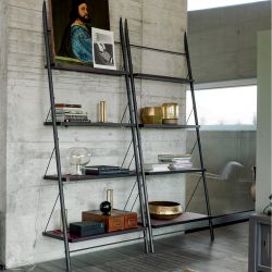 Bibliothèque aux lignes essentielles, avec structure en fer et quatre étagères en bois de chêne texturé.